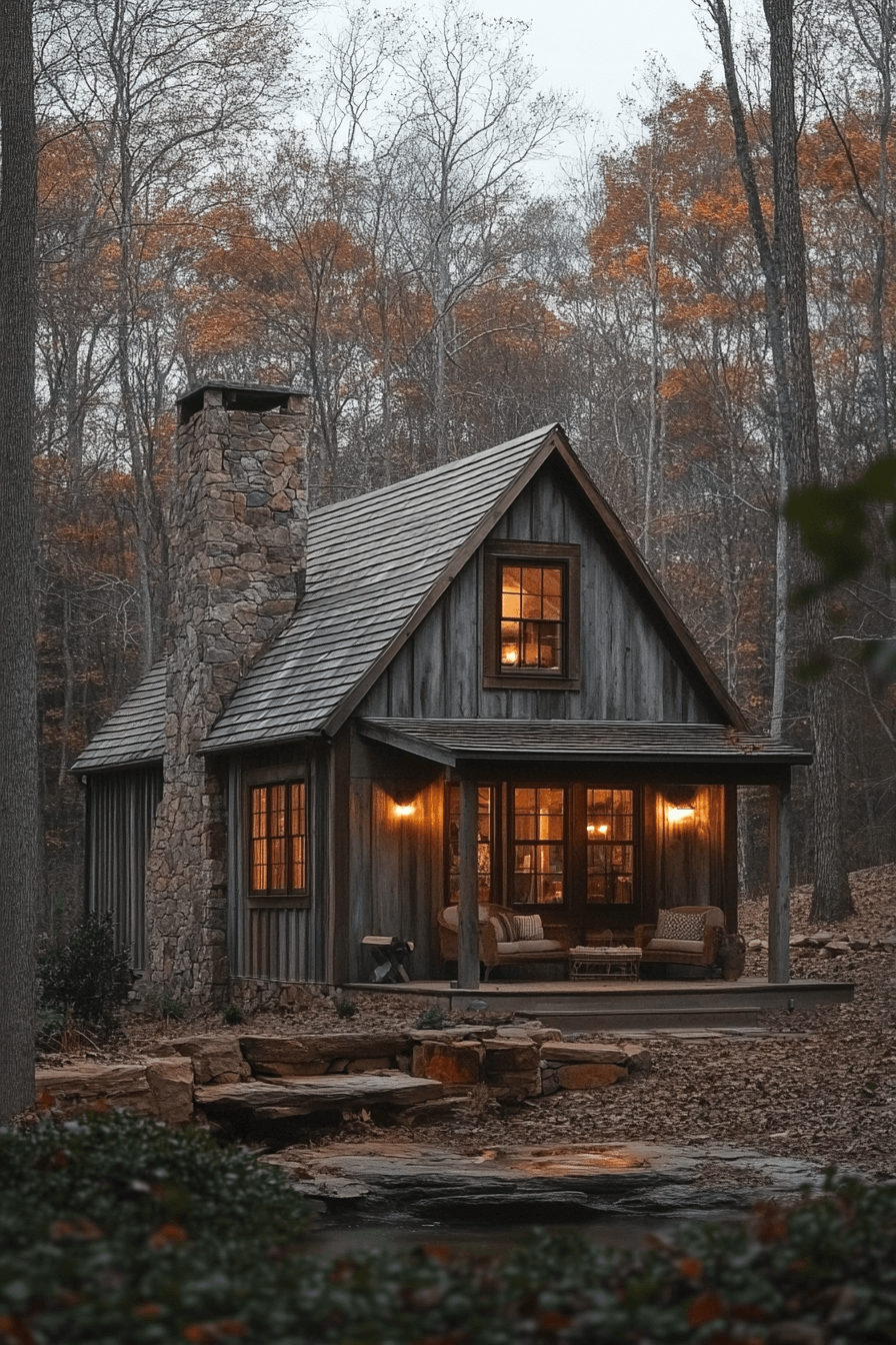 This rustic small barn house blends traditional materials like stone and timber to create a cozy and durable retreat. Whether for year-round living or a peaceful getaway, its timeless design never goes out of style. The warm, inviting space is perfect for relaxing and reconnecting with nature.