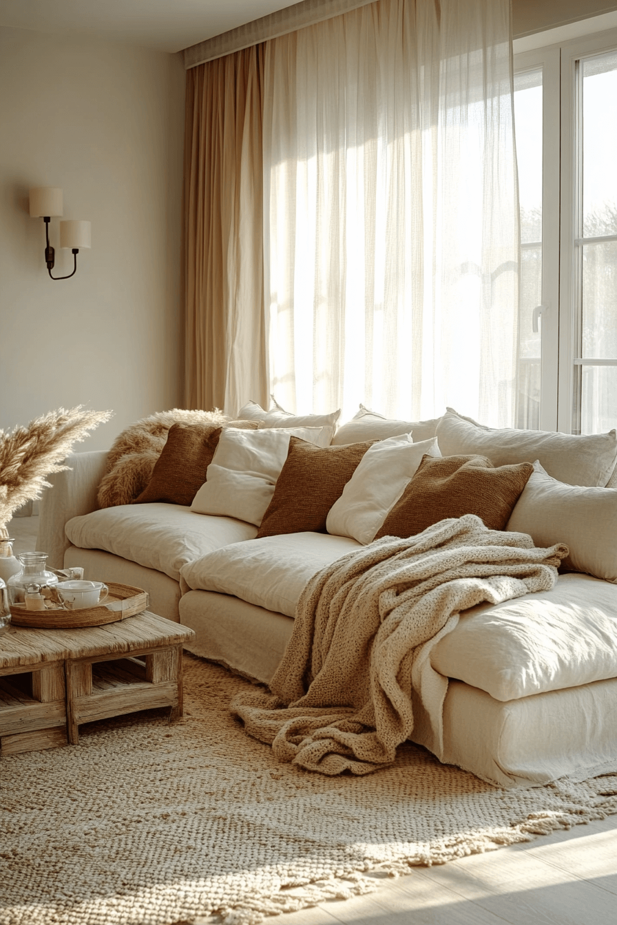 A palette of tan and cream offers timeless warmth for any home, from classic to modern styles. The apartment aesthetic cozy style shines with layered throws, textured cushions, and soft lighting accents. Clean lines keep the space modern while the colors add a welcoming touch. This look works beautifully year-round, adapting to different seasons effortlessly.