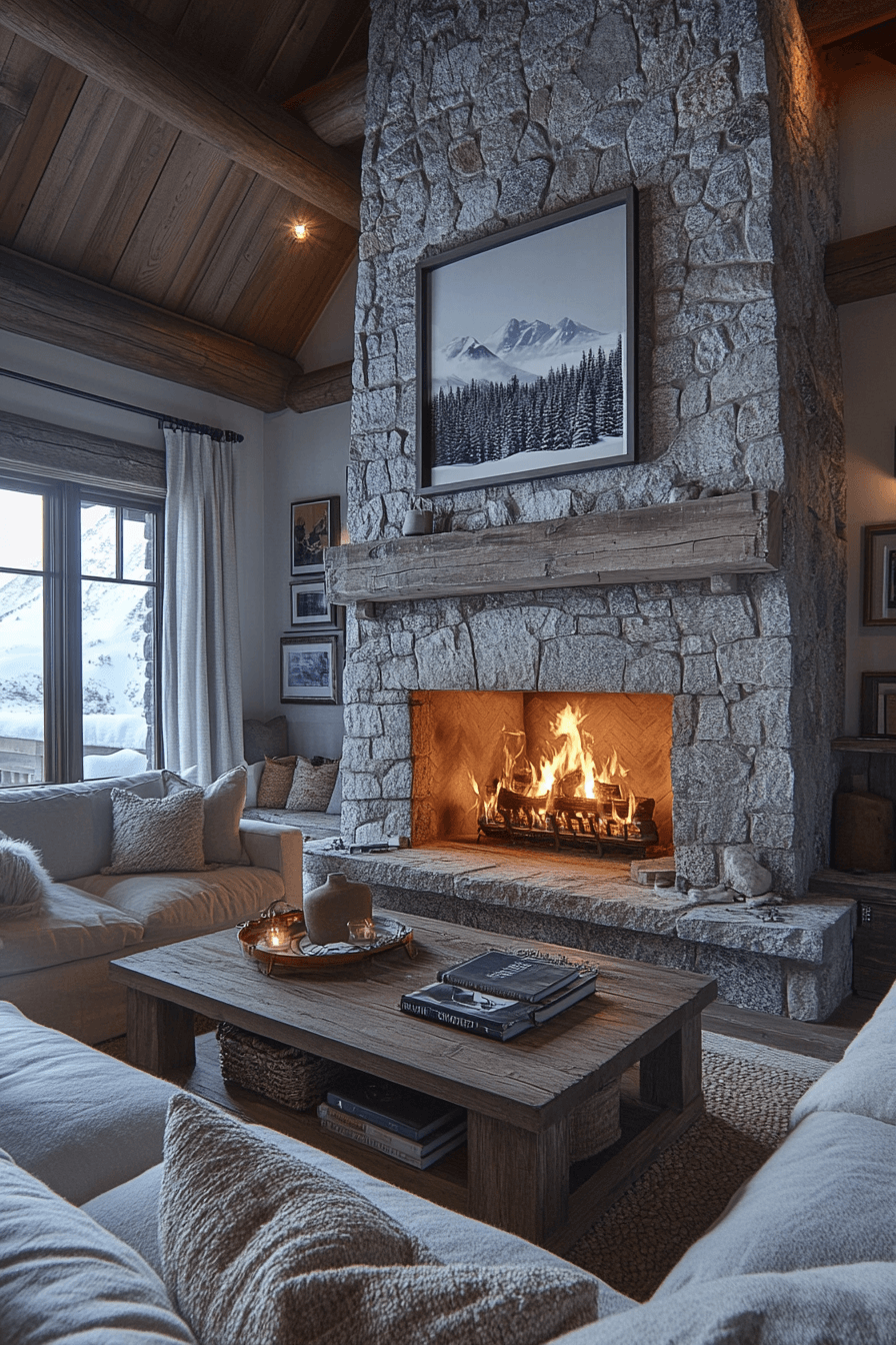 - Materials: rough-hewn timber beams, stacked fieldstone, chunky wool knits, shearling textures